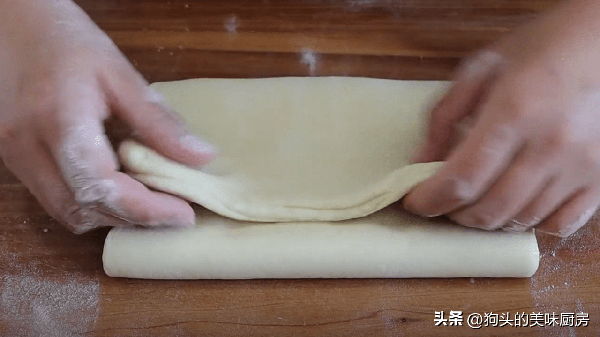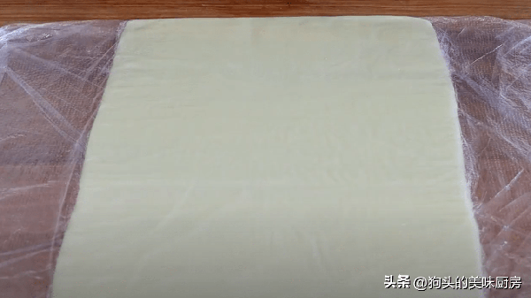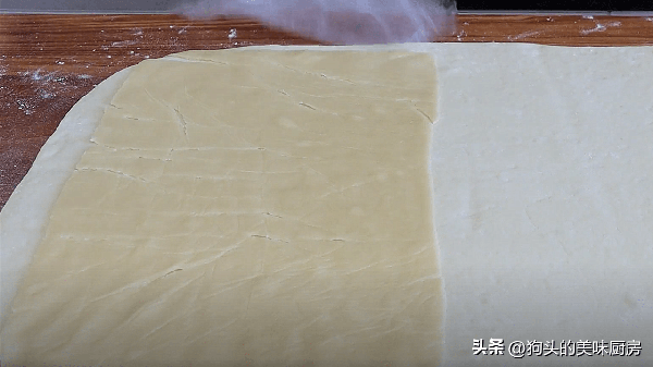 10.接著把前面搟好的油酥面片放在一半的位置,大小不一就裁幾下。