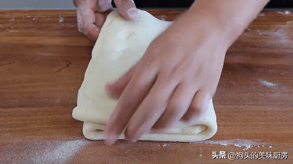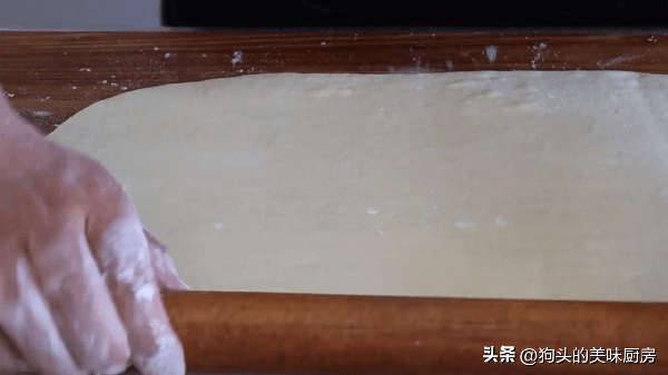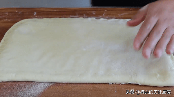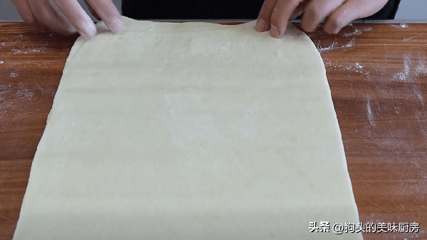 9.把它移到案板上揉搓排氣。再把它搟成長方形面片。厚度0.3-0.5厘米左右。