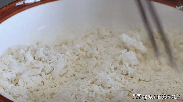 3.放到不燙手瞭之後調入3克酵母,3克食鹽,再加300克左右的面粉,攪拌成面絮狀。