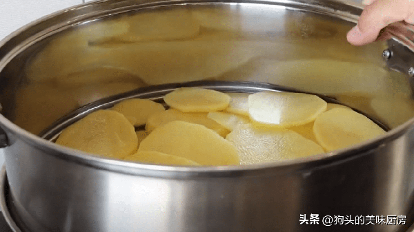 1.準備兩個中等個頭的土豆,去掉外皮,切成薄片,上鍋蒸20分鐘。