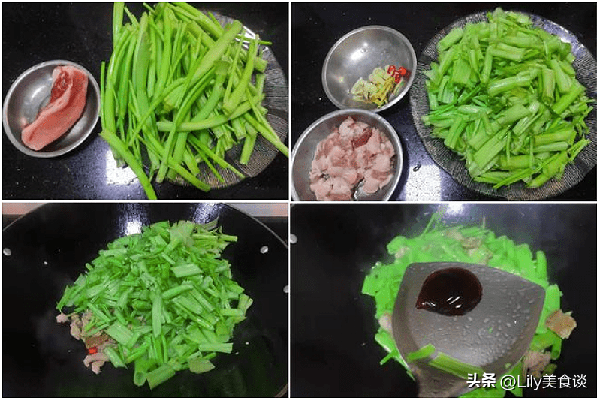 1、食材:五花肉、空心菜梗、小米辣、大蒜。