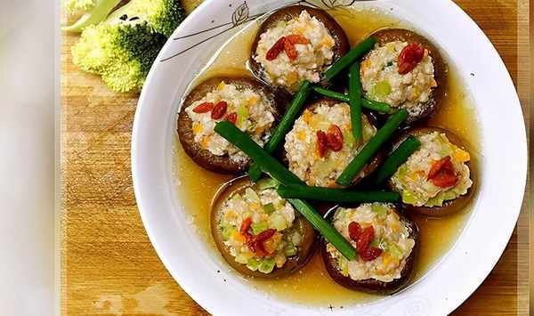鮮香菇6隻、肉末100克、玉米粒15克、豌豆15克、紅椒10克、枸杞6粒、