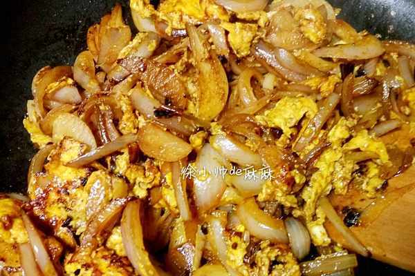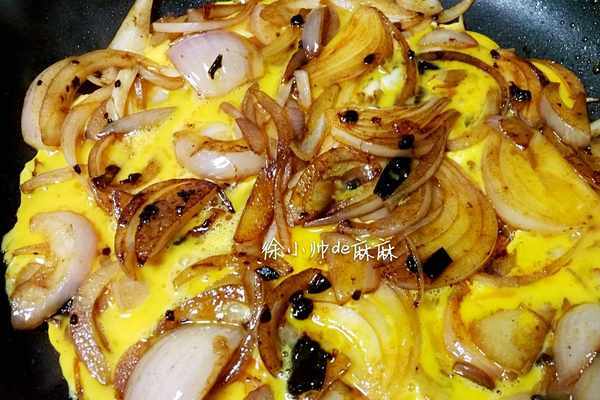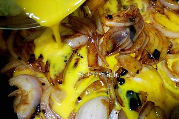 3、看到洋蔥明顯變軟瞭以後,將雞蛋液淋灑在洋蔥上面,開中火。雞蛋液稍微凝固瞭就可以和洋蔥翻炒一下。