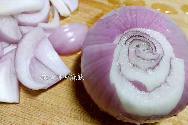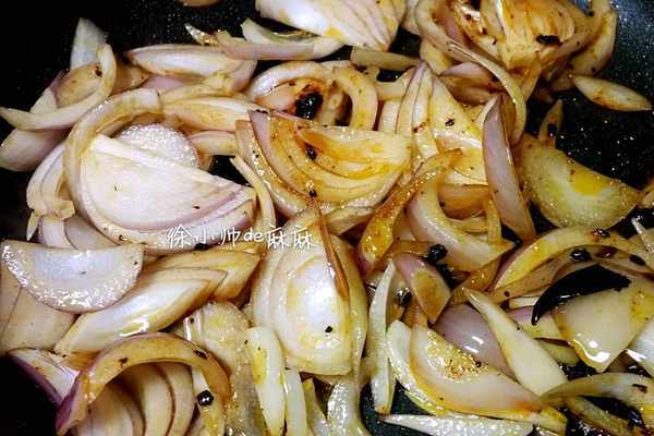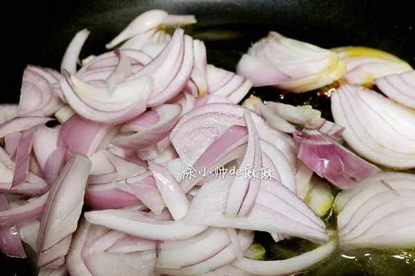 2、熱鍋熱油放入一大勺豆瓣醬或者辣醬,小火炒香。然後將洋蔥片放進去和辣醬翻炒入味。