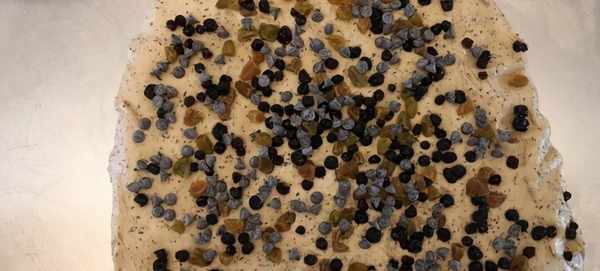 7.瀝幹藍莓幹(我裡面還有部分葡萄幹…)和巧克力豆一起與面團混合均勻攤平按摩27度75濕度發酵70分鐘分割2塊面團收圓松弛30分鐘