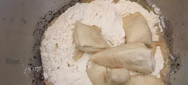 4.倒入面粉中種面團(切割大塊)