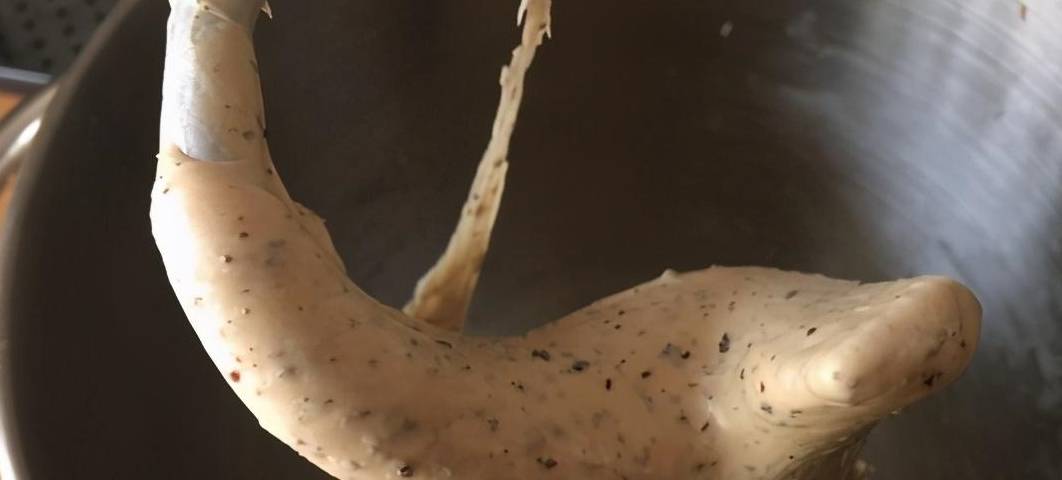 5.中速攪拌到有粗膜加入黃油中速完全吸收