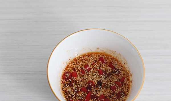 4大蒜和尖椒切碎,放入小碗裡,加入辣椒粉、白芝麻、鹽。淋入熱油,混合均勻。