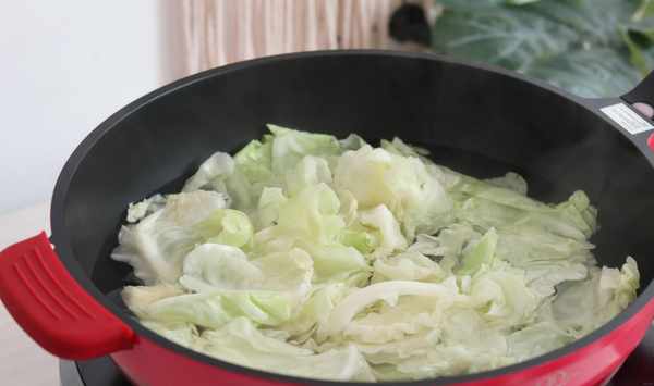 2鍋裡放水煮開,放入包菜,撒少許鹽和油,燙2-3分鐘。