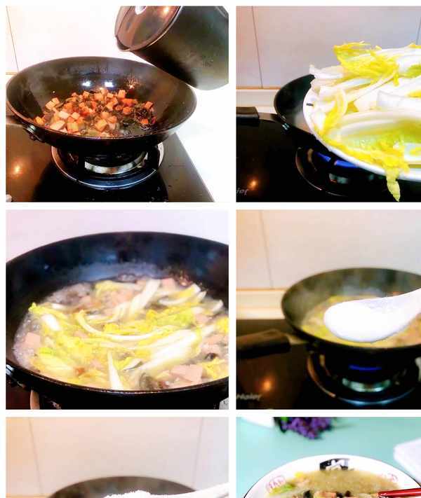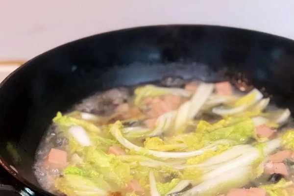 3??加入適量開水,大火繼續燒開。放入娃娃菜,煮1分鐘,加入1調味勺的鹽調味。加入1調味勺白糖提鮮。