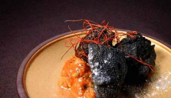 炸面包用的面團100克、幹貝2顆、洋蔥20克、蒜頭10克、香菜20克、紅甜椒1顆、番茄糊5克、竹炭粉1克、細糖粉2克、煙熏風味Tabasco、檸檬汁、paprika、鹽巴、黑胡椒