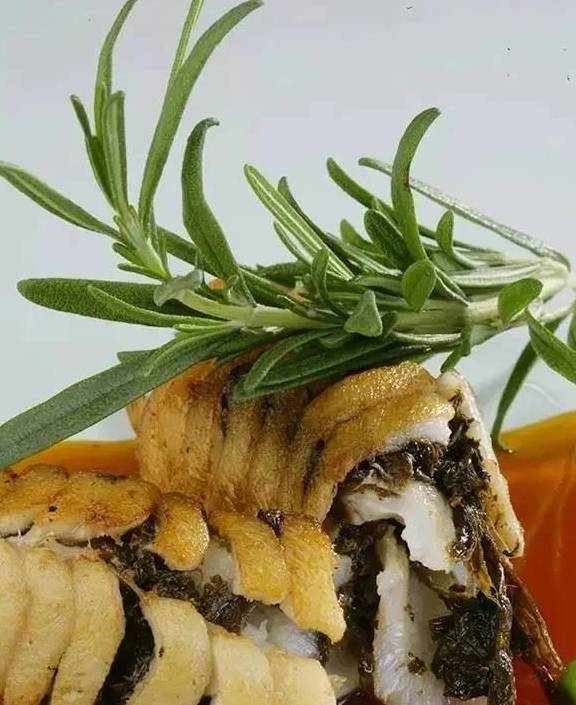 鹽、料酒、黃油、胡椒粉制作:1.鱸魚去骨皮,片成0.5厘米厚的大片。2.將肉片加入調料醃制入味。3.雪菜入鍋炒熟卷入魚肉片中,用模具固定,炸至金黃取出,調味燒至成熟,改刀裝盤、澆汁即可。
