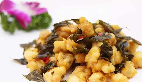 2.鍋內放油,油溫四五成熱的時候,將茶葉下鍋炸制幹香,撈出備用;