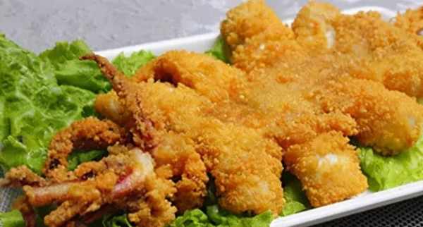 4.魷魚炸至金黃熟透,就可以取出來;