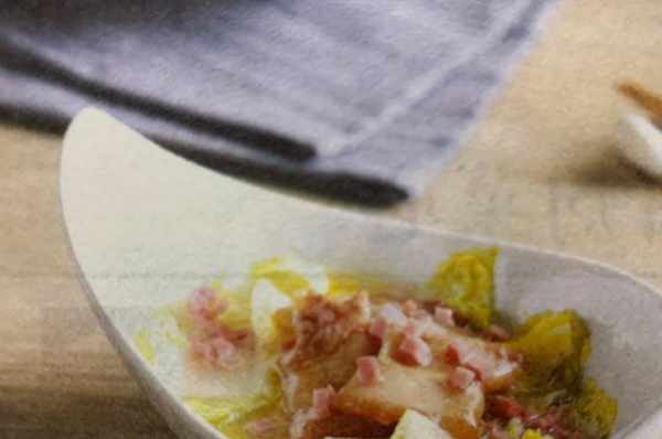原料:白菜500克,五花肉100克,火腿25克