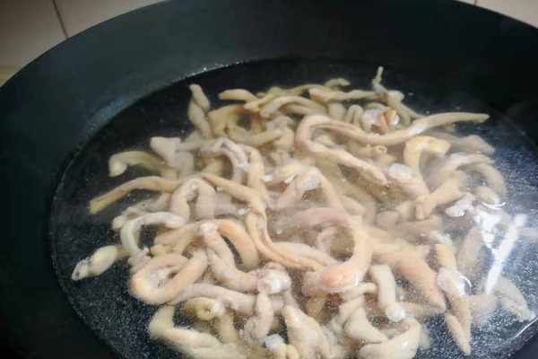 2、雞腸一定要清理幹凈,腸子上的油脂多,用生粉搓洗,淘洗幹凈後,再倒入兩鹽搓洗,去除雞腸的粘液和異味,鍋內加適量的水,放入適量料酒,大火煮開以後,將雞腸放入煮沸5分鐘。