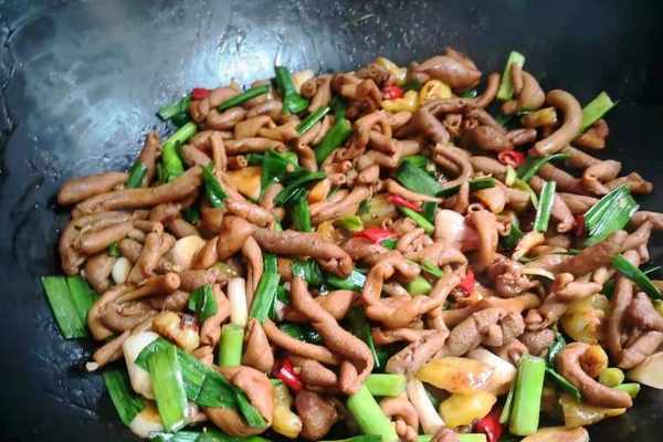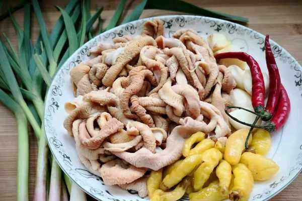 食材:雞腸、蒜苗、小米椒、蒜粒、薑、泡椒、面粉、生抽、鹽。