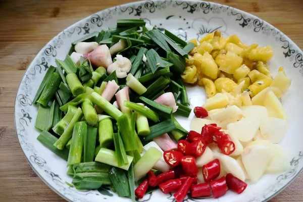 4、蒜苗清洗幹凈切成段,小米椒,泡椒切成小段,蒜薑切成片。