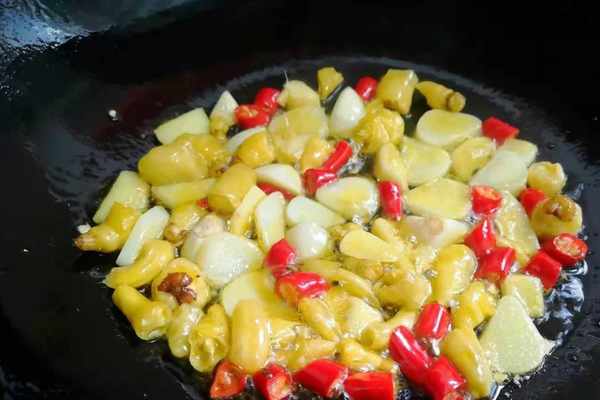 5、鍋裡倒入植物油,油熱後放入準備好的小米椒泡椒段,薑蒜片炒出香味。