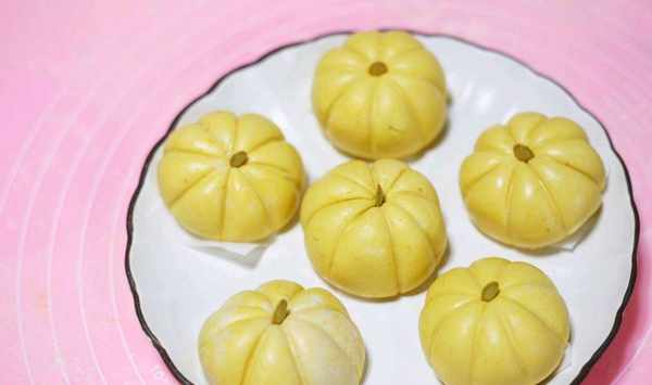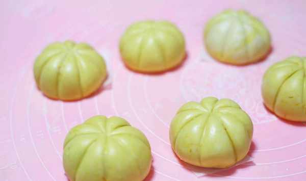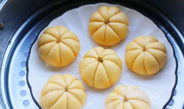 7、在每一個南瓜上面都放上一個南瓜籽,做好瞭放在油紙上面。南瓜籽可以用枸杞來代替,或者是葡萄幹之類的,都可以。然後再將做好的南瓜球放進蒸鍋裡面,上鍋大火蒸個20分鐘左右即可。南瓜的形狀自己掌握,喜歡立體感好的就包的豎起來高一點,喜歡像我做的這個稍微扁一點的也可以,如果做的小小的南瓜團,一口一個,那也是極好吃的呢。