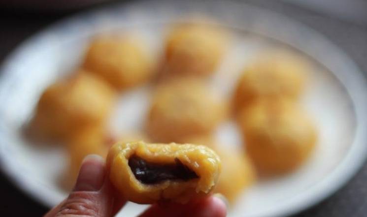 【食材清單】:南瓜200克,糯米粉100克,奶粉2勺,玉米淀粉30克,紅豆餡50克,南瓜籽6個。