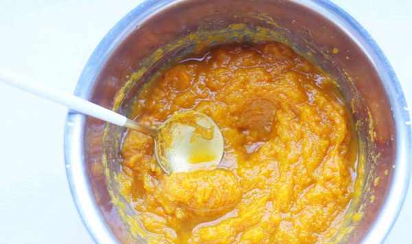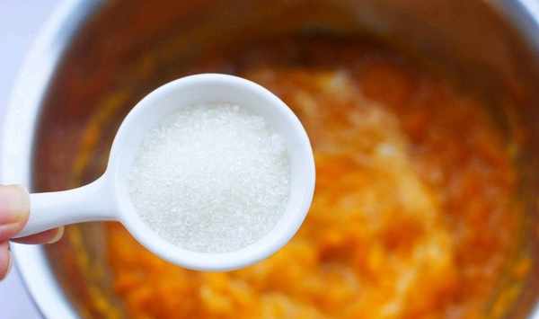 2、把南瓜清洗幹凈瞭以後把瓤去掉,皮也去掉,切成小塊,用大火把南瓜蒸熟,取出來以後壓成泥。然後再把奶粉還有白糖都下進去。