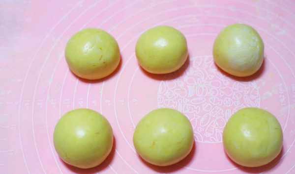 5、將面團分成平均大小的6份,揉圓瞭以後壓扁,把紅豆餡也都揉成6個小圓球,一定要比南瓜面餅小的小球才行。再將紅豆沙餡放在壓扁瞭的面團上面。