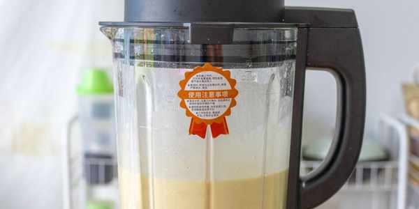 5、剩下的芒果邊角料全部倒入料理機中,然後加15克白糖300克椰漿250克純牛奶打成細膩的芒果奶昔,打好後先放一旁備用。