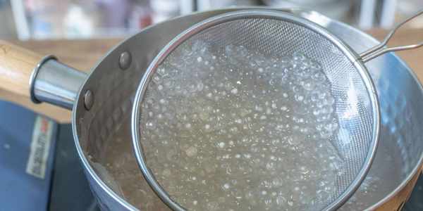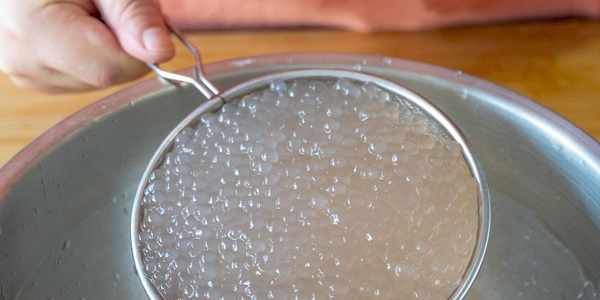 7、接著我們來看一下西米,已經完全燜熟瞭,一點點白芯都沒有瞭,撈出來後迅速的放到涼水中降溫,直到西米完全變涼後再倒出來瀝幹水分。