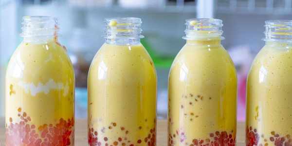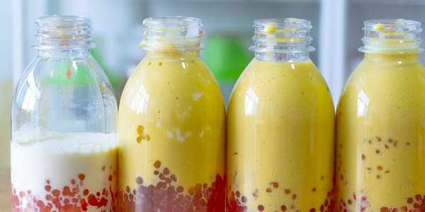 8、接著準備幾個幹凈的瓶子,最下面一層先放上芒果丁,接著放西柚,然後舀入西米,最後倒入打好的奶昔,好喝又好看的楊枝甘露就完成啦。