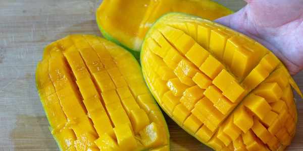 4、燜西米的時間我們剛好來切水果,楊枝甘露必備的就是芒果和西柚瞭,1個大芒果沿兩側各切一刀切成三片,然後劃十字格後切成芒果丁。