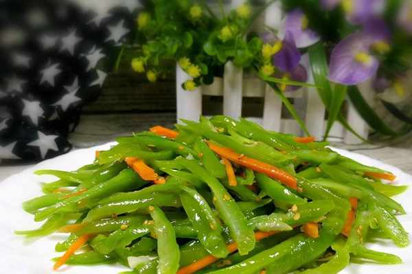 涼拌豆角,選擇鮮嫩的新鮮豆角,用清水洗幹凈以後切成均勻的細絲,往鍋裡面添加些清水,開火煮沸以後將豆角下進去,可以少加一點油和鹽,這樣能讓焯好的豆角的顏色更加的翠綠,將焯熟的豆角撈出來控下水。豆角放到盤子裡,在豆角的上面放上辣椒段,蒜末,再加入食用鹽,香醋,然後澆上一勺熱油,用筷子拌一下就完成瞭。