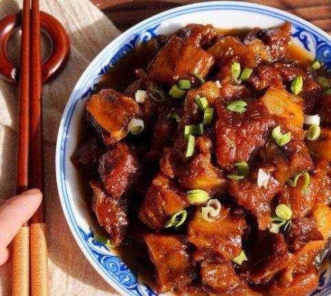 紅燒牛肉:牛腩洗凈焯水後再洗凈,鍋內放菜油煸香八角桂皮花椒幹辣椒蔥薑後再放牛腩煸透,倒入黃酒後蓋上鍋蓋悶一會再放入電壓力鍋,加入適量的生抽、老抽、冰糖、麻辣鮮和漫過牛腩的熱水,電壓力鍋15-20分鐘排氣後倒回鐵鍋裡用大火收幹湯汁。