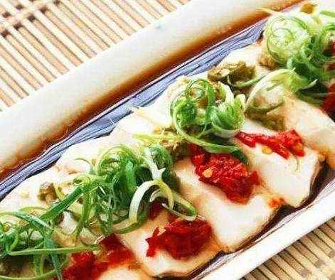 4、關火後,將豆腐盤拿出,去掉保鮮膜,灑上瀝幹水的蔥絲,燒中熱油後潑上即可。