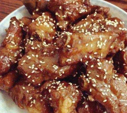 糖醋小排:肋排斬小段,沖洗幹凈,鍋裡加水,肋排放入,大火燒開,肋排撈出,濾水,用廚房紙巾把肋排上的水擦幹,鍋裡加油,肋排煎至金黃。蔥段、薑片放入,放入所有的調味料,大火燒開,小火燉煮至軟爛,大火收汁即可。