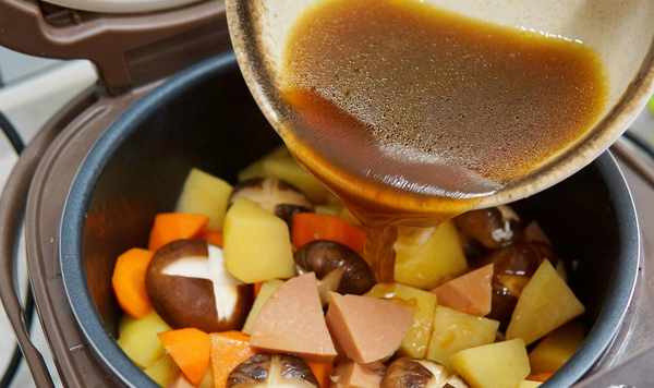 4、大米清洗幹凈後倒入電飯鍋,不用加入清水,大米上直接鋪入剛剛炒好的菜,將菜湯倒入電飯鍋中,菜湯的量就跟平時蒸大米時的量一樣就好,接下來按煮飯鍵,等待米飯燜熟後,一碗鮮香下飯的土豆燜飯就做好瞭。
