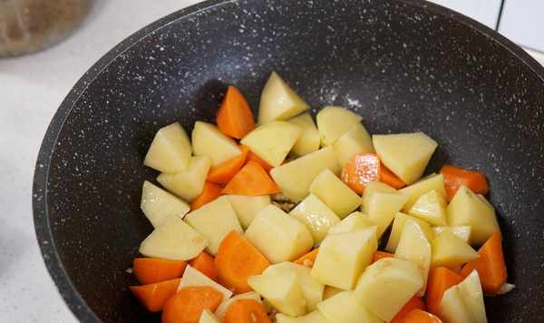 2、鍋中加少許油,油熱倒入蒜末、香蔥碎,炒香後倒入土豆塊和胡蘿卜塊,翻炒1分鐘左右。