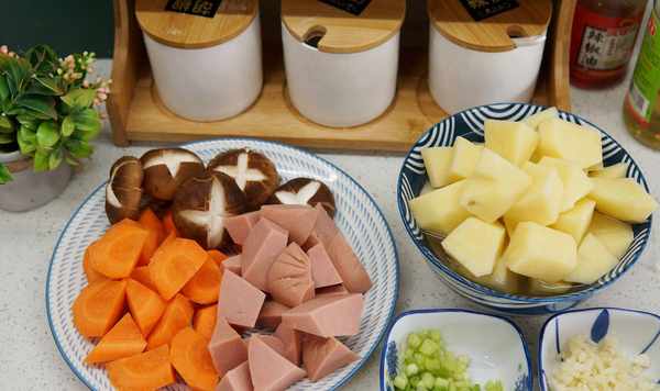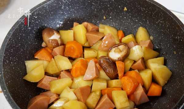 1、土豆清洗幹凈,去皮後切滾刀塊,胡蘿卜洗凈同樣切滾刀塊,香腸切塊,香菇洗凈表面劃十字花刀,香蔥切碎,大蒜切末備用。