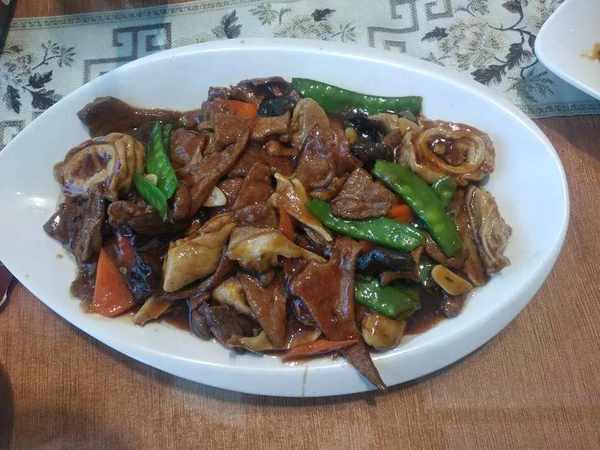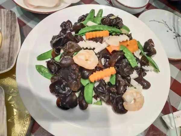 廣東人去哪都要來點青菜,因為點青菜還鬧瞭笑話,因為在東北人的眼裡,青菜就是素菜,像蘿卜、土豆和豆角這樣的都算是“青菜”,而廣東人的青菜就是單純的綠葉菜,最後服務員給推薦的這個用山藥、木耳和荷蘭豆炒的清肺小炒,畢竟在這傢餐館裡除瞭蘸醬菜以外真沒有單獨爆炒的綠葉菜。
