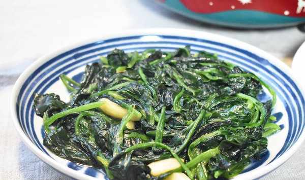 紅薯葉就是地瓜葉,我傢很喜歡紅薯葉炒軟後滑溜溜的口感,如果要炒紅薯葉好吃,把紅薯葉的莖撕一下薄衣。我沒有撕紅薯葉的莖,隻是把老的部分摘掉。炒鍋燒熱油放入蒜蓉和紅薯葉爆炒幾下,等紅薯葉炒斷生瞭,蓋上蓋子燜一分鐘左右,放入鹽調味再關火裝盤。
