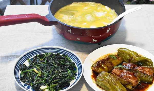 七月份,氣溫高,晚餐要有湯水,工作日下班沒有時間煲湯,我都會滾湯,冬瓜、絲瓜、節瓜滾湯都非常適合夏天,用這些瓜果煲湯或者滾湯清涼解暑。於是,我用節瓜、咸蛋和瑤柱滾湯,我還做瞭炒紅薯葉和煎釀辣椒,我們兩口子的晚餐一葷一素一湯,簡簡單單的晚餐花瞭不足30元,每一樣都很鮮美,非常好吃,很合我們兩口子的口味,我媽把這些全部吃光,沒有浪費。