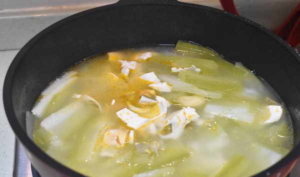 節瓜炒一下再煮湯,湯水更好喝。把熟咸蛋剝殼切成小塊,咸蛋和瑤柱一起放入節瓜湯中,蓋上蓋子用中火煮10分鐘左右,煮好試一下味道再放鹽調味。這裡要註意咸蛋和瑤柱都有咸味,不要放太多鹽。