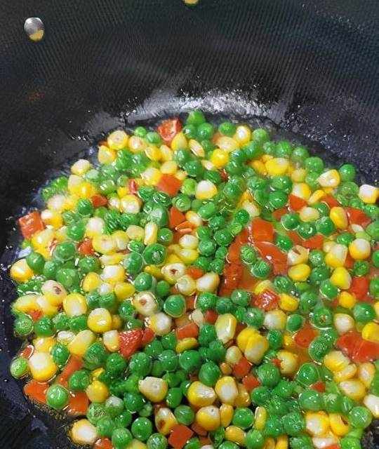 4、加入玉米粒,翻炒30秒。