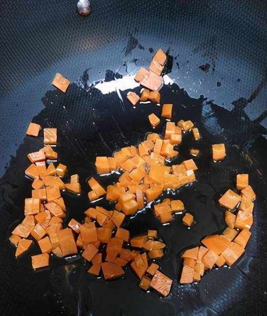 2、鍋裡給少許花生油(或者傢用炒菜油),先炒下胡蘿卜(約30秒)