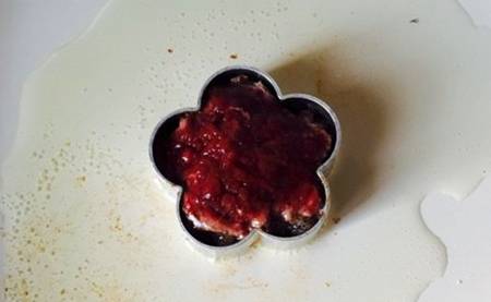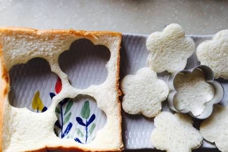 土司兩片,用花朵形狀的餅幹模壓出花型。