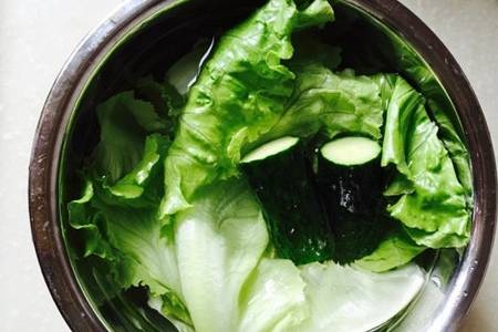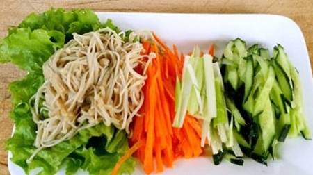 黃瓜、胡蘿卜、蔥切成絲,金針菇焯水過涼瀝幹水份、生菜洗凈備用。