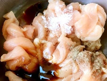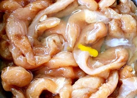 雞胸脯肉切成條狀放入黑胡椒粉、料酒、蠔油、醬油、糖,醃制半小時加入蛋清、淀粉拌勻備用。