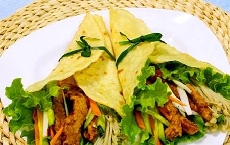 將餅平鋪,擺上生菜、蔥、金針菇、黃瓜、胡蘿卜、雞柳卷好即可。