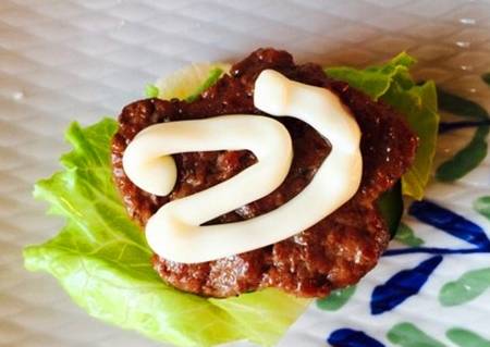取一片吐司,放上生菜、黃瓜,再放上牛肉餅,擠上沙拉醬,最後蓋上土司即可。