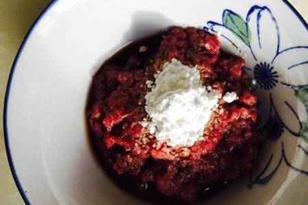 牛肉切塊剁碎,用料酒、生粉、醬油、胡椒碎和鹽醃制抓均。